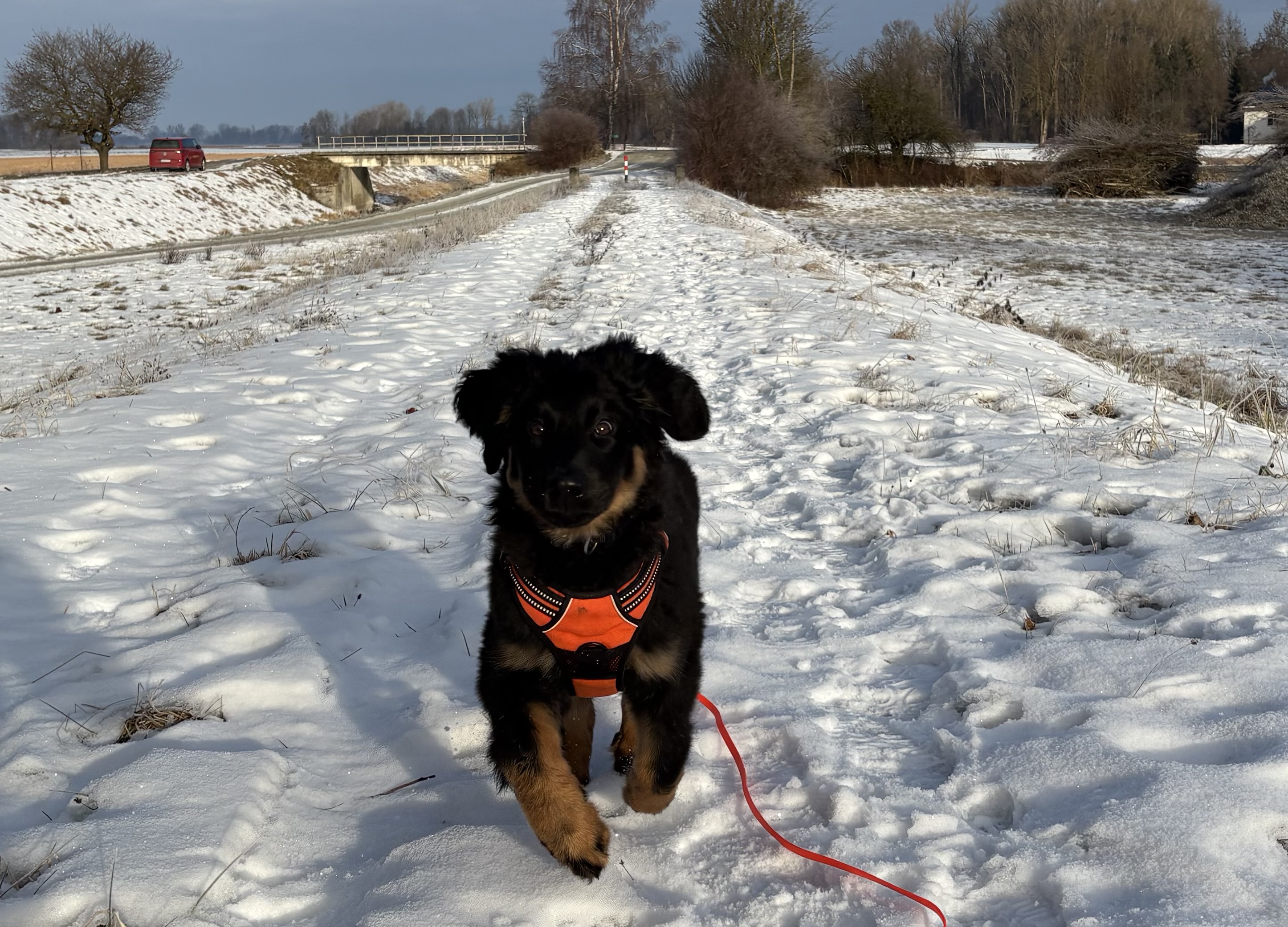 Frauchen hatte heute die falschen Kekse mit. Also kein Welpenfutter, sondern welche für die großen Hunde. Diese lösten bei mir aber den Dynamitmodus aus und ich bekam einen Flitzie nach dem anderen. Wir hatten allertolltes Morgenwetter und Schnee lag auch noch. Ein paar Bilder hat Frauchen auch noch mitgebracht. Damit ihr sehen könnt, wie groß ich schon geworden bin! Eure Ellis