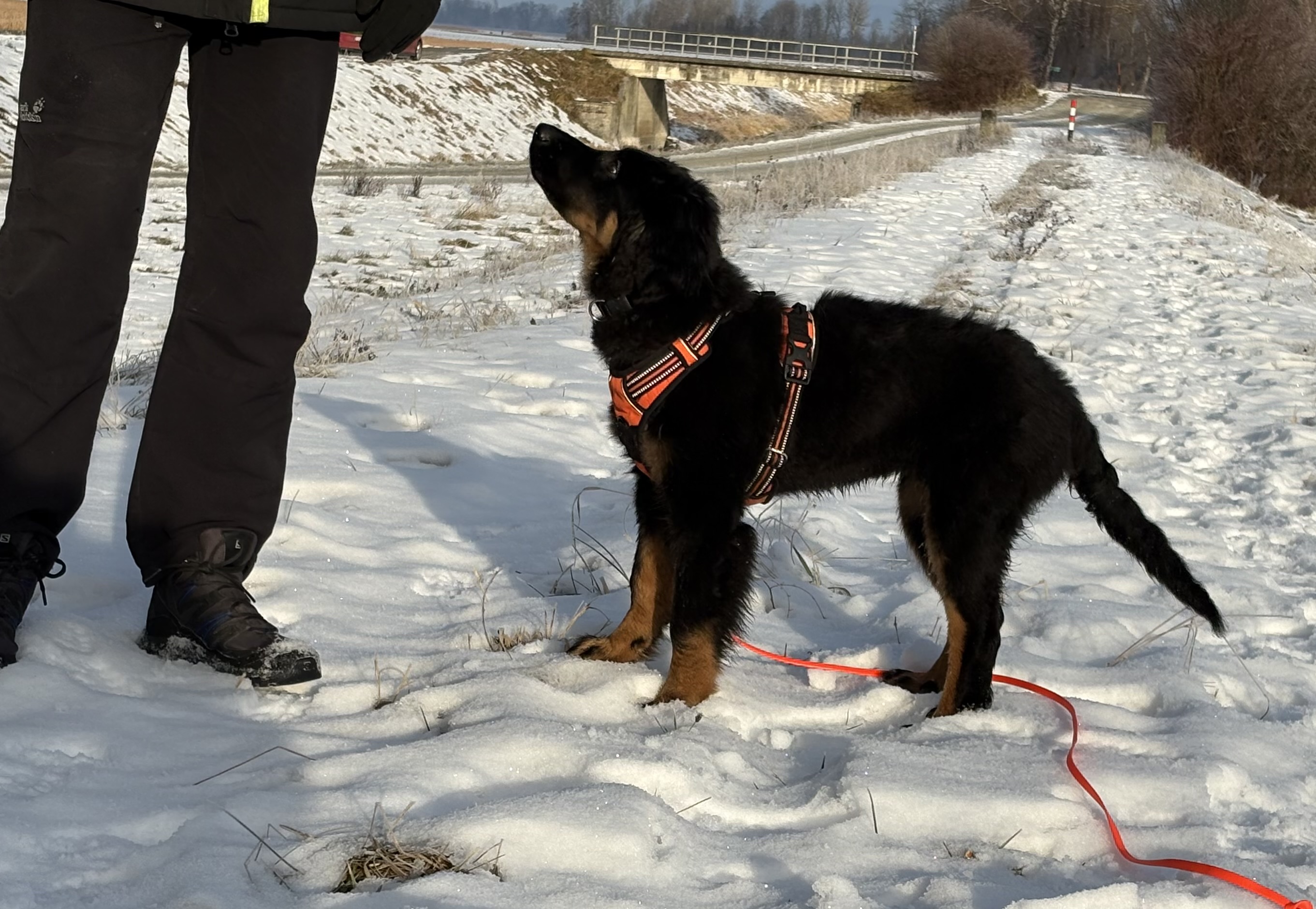 Die letzte Übung des heutigen Tagen war wieder das „Warte“ Signal. Das haben wir die letzten Tage schon aufgebaut. Frauchen steht neben mir, legt die Hand vor meine Brust und ich muss stehen bleiben und warten. Heute das erste Mal mit dem heiligen Napf vor mir. Das war echt schwer! Aber nach dem vierten oder fünften Mal hat sie die Hand gar nicht mehr benötigt, ich wusste nämlich schon dass ich auf die Freigabe warten muss. Später soll das Signal im Freilauf dazu dienen, dass ich stehen bleibe. Egal, was ich vor mir sehe. Dahin ist es zwar noch ein längerer Weg aber ich gebe mir voll Mühe, alles zu lernen, was Frauchen mir beibringen wird. Versprochen. Eure Ellis!