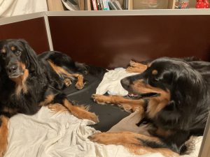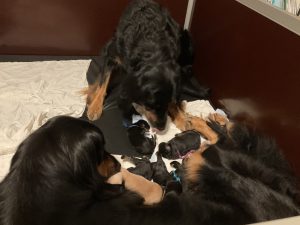 Alles im grünen Bereich (kein Handlungsbedarf, alle fühlen sich wohl): die Welpen murkeln, knörzen, oder es herrscht einfach himmlische Ruhe mit leichtem Schnauben. Das ist ungefähr 98% des Tages der Fall.