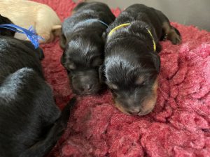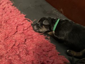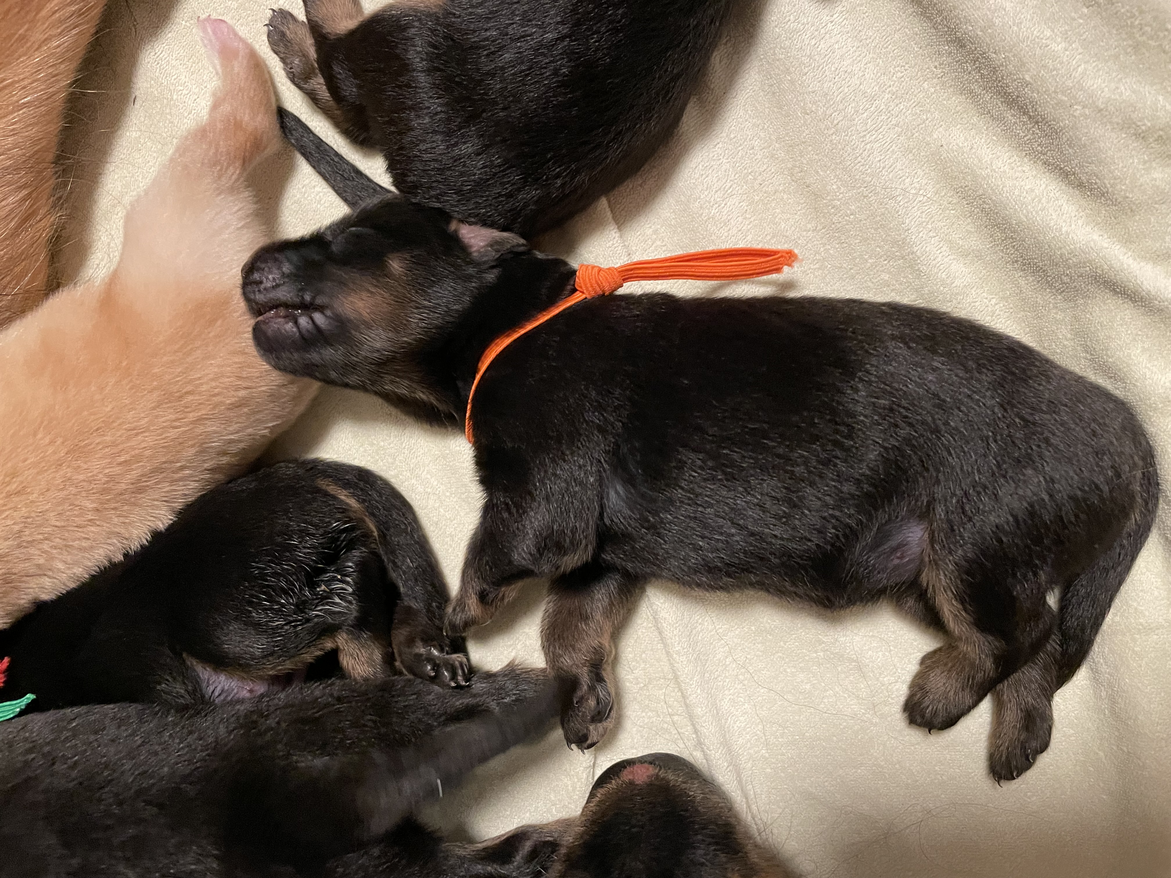 Also nicht dass ihr glaubt, so kleine Welpen könnten noch nicht differenziert kommunizieren. Ihr Repertoire ist schon sehr beachtlich! Was sie alle sehr gerne mögen, ist zusammen im kuscheligen Ausweichbettchen zu liegen, wenn Frauchen die Wurfbox saubermacht. Farblich sortiert natürlich: