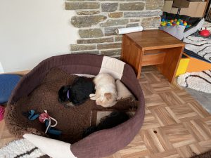 Abends geht der Weg übrigens wieder zurück und sie schlafen dann in der Nacht wieder alle bei uns im Haus. Das klappt dieses Mal besonders gut ohne große Geruchsbelästigung. Sie haben das nämlich mit dem Heuklo voll kapiert! Einmal wollen sie in der Nacht noch Futter und wachen alle auf. Dann macht Frauchen die Luke auf, sie flitzen nach draussen, machen ihre Häufchen und kommen wieder rein. Prima, oder?