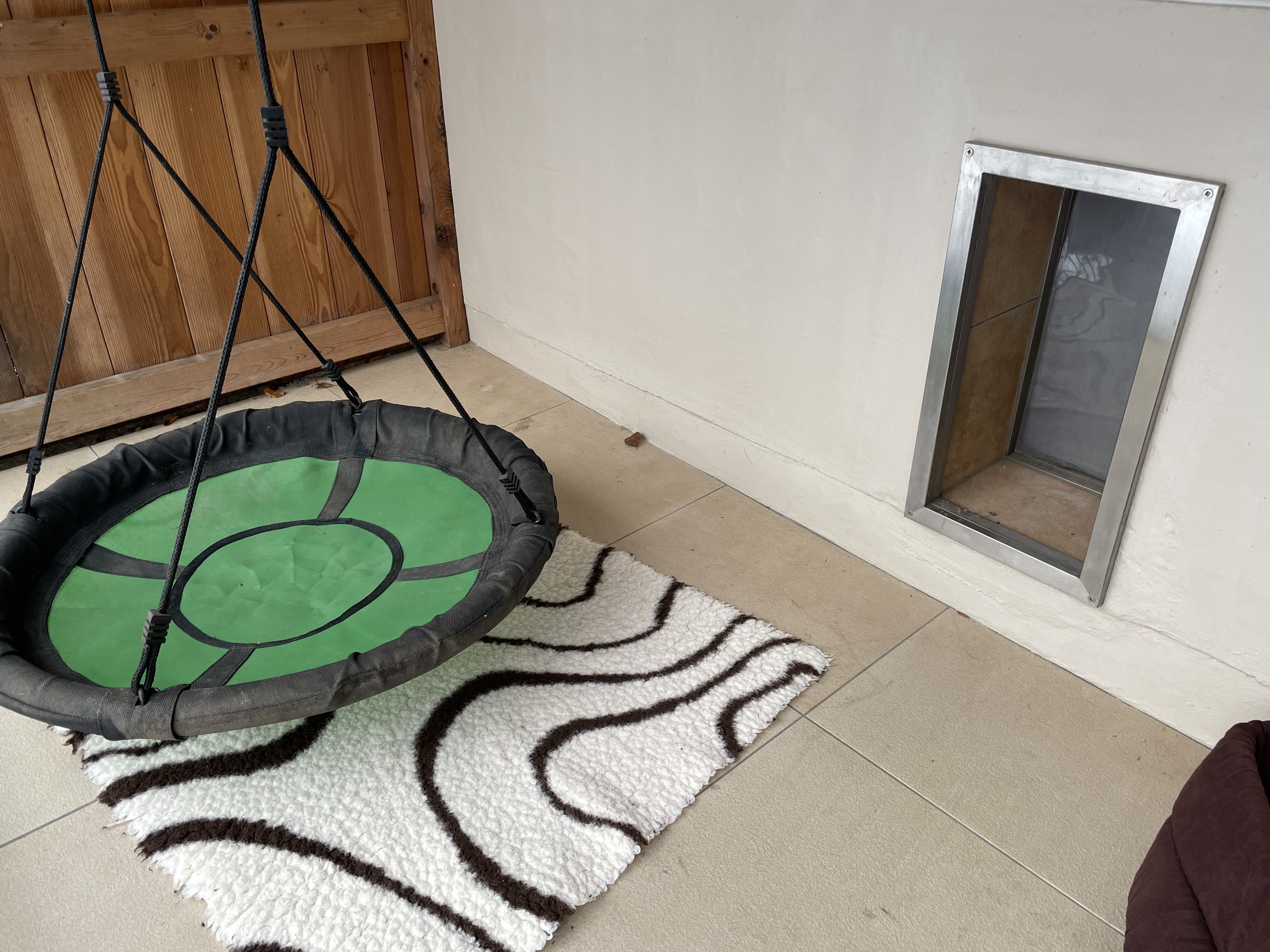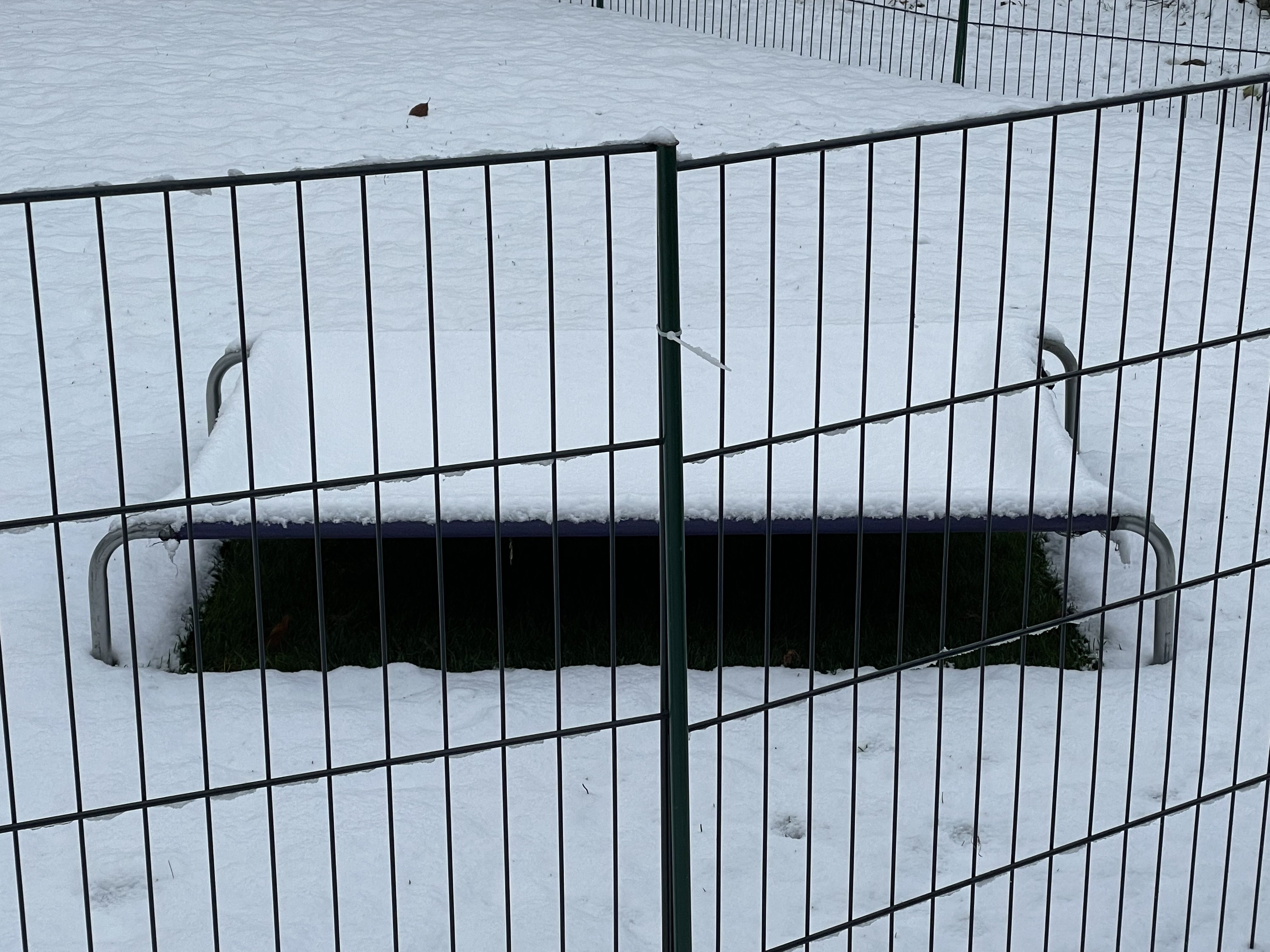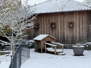 Oh, wir sind froh, die Umzäunung gestern noch fertiggestellt zu haben. Heute können sie zwar noch nicht drin toben, es ist einfach zu nass und zu kalt. Aber sie sind auch gerne im kleineren Auslauf unter Dach und immer wollen ein paar tagsüber auch mal draussen schlafen. Sieht sehr gemütlich aus!