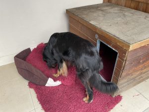 Natürlich gibt es auch dort kuschlige Plätze und eine isolierte Hütte. Ganz verfrorene können auch nach innen in einen kleinen Zwinger gehen, dort wird etwas geheizt und es gibt Liegen und Hundebetten für alle. Hier inspiziere ich, ob alles in Ordnung ist.