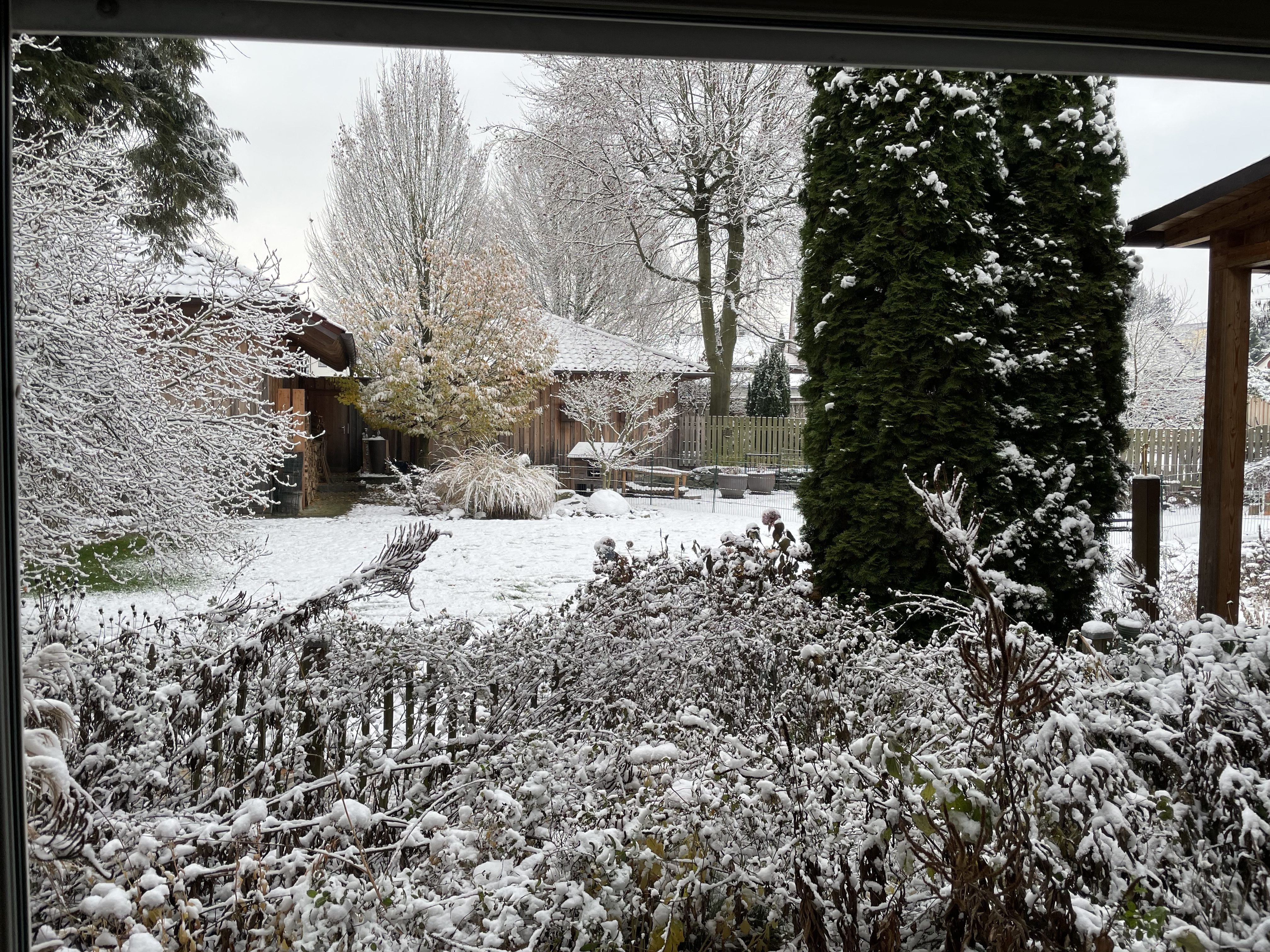 Heute früh kam er, der Winter! War in der Nacht von Schnee noch nichts zu sehen, war der Blick aus dem Fenster heute so: