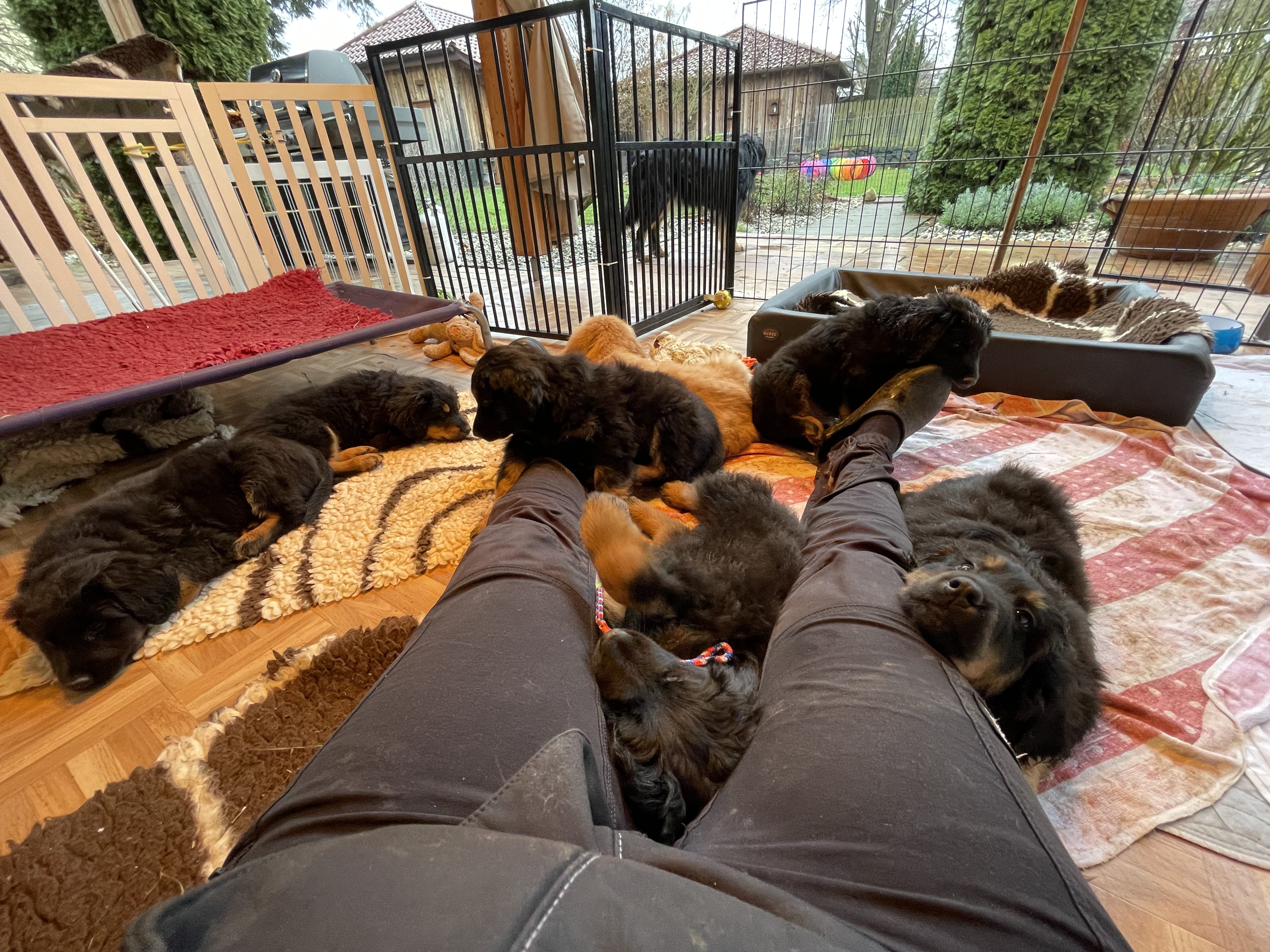 Tagsüber waren die Welpen heute direkt gut zu haben! Die Sonne schien und sie vergnügten sich im Garten. Ohne großes Geschrei. Frauchen kam mehrmals für eine Weile dazu und schon waren alle da. Einmal wurde glatt eine kleine Schlafrunde bei Frauchen eingelegt. Das war richtig gemütlich!